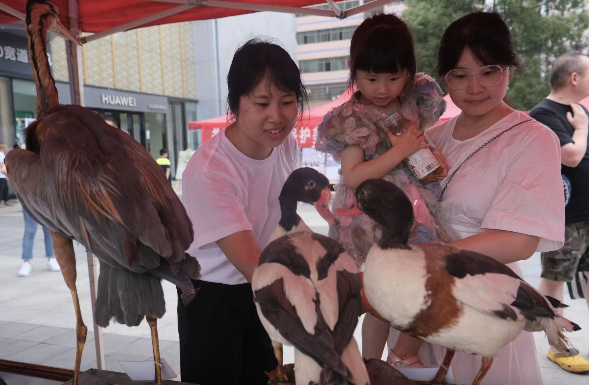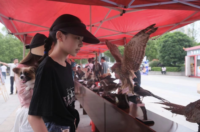 “鹗,猛禽,在湖南省为旅鸟,种群数量极为稀少,洞庭湖偶有分布,十分罕见……”5月21日,在中心城区万达广场,市林业局联手市生态环境局开展“国际生物多样性日”宣传活动,宣传保护生物多样性的重要意义。 20多个珍稀鸟类标本精彩亮相,吸引无数市民驻足,工作人员向参观群众认真讲解各种珍稀鸟类的特性。