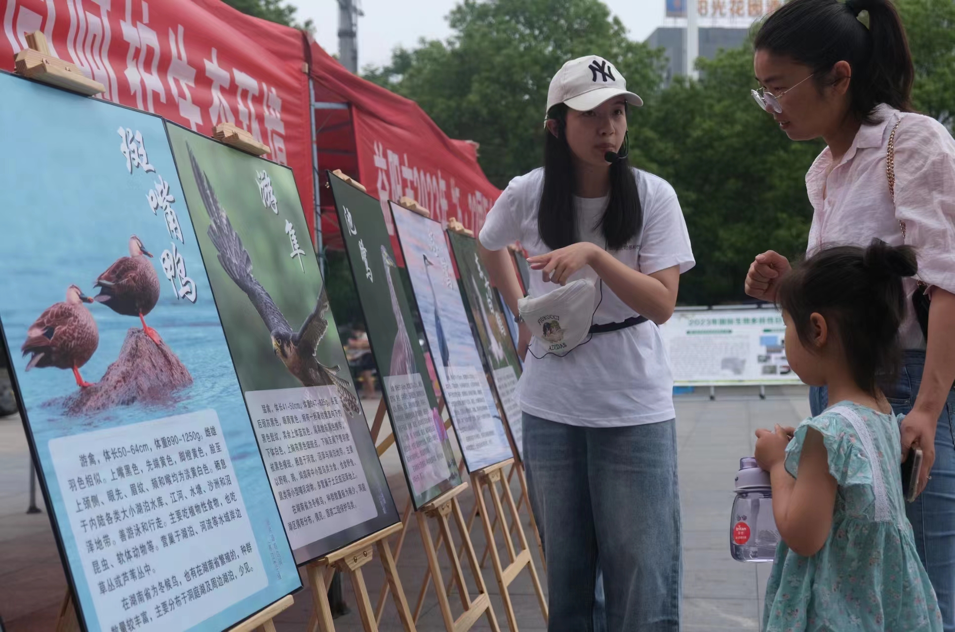 今年的5月22日是第23个“国际生物多样性日”,主题为“从协议到协力:复元生物多样性”。在现场,工作人员邀请市民线上答题过关并赠送书籍《八百里洞庭我的家》,展示珍稀鸟类标本,摆放宣传展板,向群众介绍“国际生物多样性日”的由来、生物多样性保护等方面知识,倡导市民关注生物多样性,共同呵护生态环境。当天参展的珍稀鸟类标本,是现场最大的亮点,都是来自南洞庭湖常见的鸟类,包括黑鹳、小天鹅、白琵鹭等国家一级、二级保护鸟类。栩栩如生的标本让市民纷纷拍照合影。“我们还会走进校园、社区,向公众宣传保护生物多样性的重要。希望通过活动,呼吁社会各界共同努力,主动作为,走出一条生物多样性保护与高质量发展相辅相成、相得益彰的新路子。”市林业局总工程师易合成说。