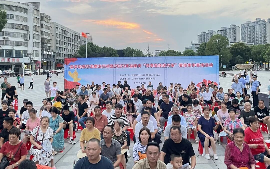7月25日晚,益阳市夏季治安打击整治行动暨2023年“禁毒宣传进万家”夏夜集中宣传活动在资阳区鹅羊池广场拉开帷幕。本次活动由市禁毒办、市公安局主办,资阳区禁毒办、区公安分局、区卫健局、区市监局、汽车路街道、大码头街道、长春经开区等单位协办。资阳区人民政府副区长、区公安分局局长、区禁毒委副主任刘洪波,市禁毒办专职副主任、市社会化禁毒办主任夏萍等参加活动。