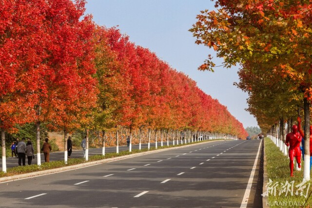 初冬时节,益阳东部新区鱼形湖东侧红枫道如霞似火。