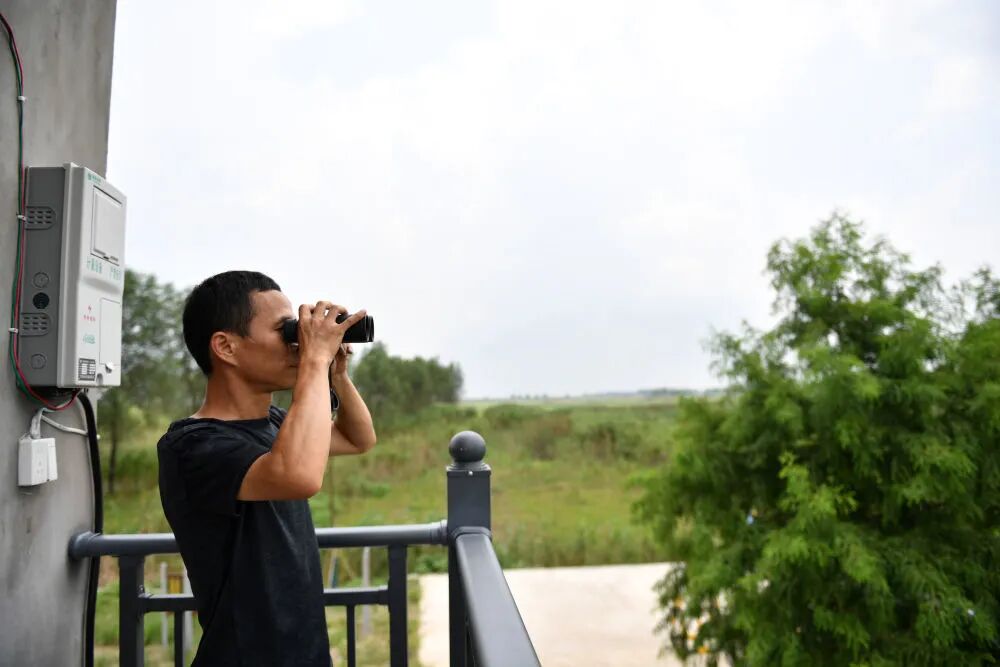 陈新在舵杆洲一处瞭望台查看湖区情况 新华社记者陈振海 摄