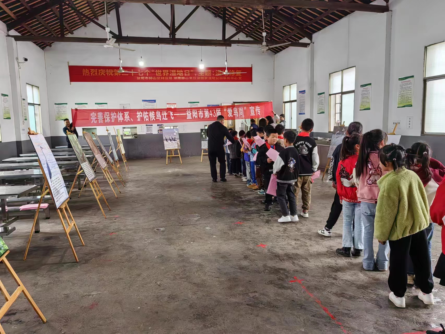 4月2日,益阳市林业局联合赫山区林业局、南洞庭湖湿地管理局、益阳市野生动物保护协会等单位,深入候鸟集中区域来仪湖国家湿地公园周边的笔架山、泉交河、欧江岔、八字哨、兰溪等乡镇开展宣传活动。通过播放保护候鸟倡仪、悬挂横幅、发放宣传单等方式进入社区、市场、集镇、学校等宣传方式,普及野生动物相关法律法规和野生动植物、爱鸟护鸟保护知识,引导市民不猎捕、不买卖、不食用鸟类等野生动物。在凤凰湖小学向广大师生介绍“爱鸟周”的由来及保护鸟类的重要性,宣读《完善保护体系,护佑候鸟迁飞》的倡议书和近年来益阳发现的破坏候鸟事件,摆放鸟类和野生动物图文展板,教导同学们辨认鸟类,通过图文并茂的方式,向同学们科普鸟类知识和通过学生向家长、社会灌输保护意识。同学们表示:鸟儿是人类的朋友,保护它们就是保护我们自己的未来。