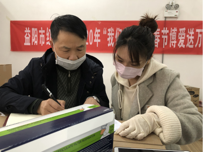 (2月2日,杨莹在对受赠医疗物资进行查验登记)