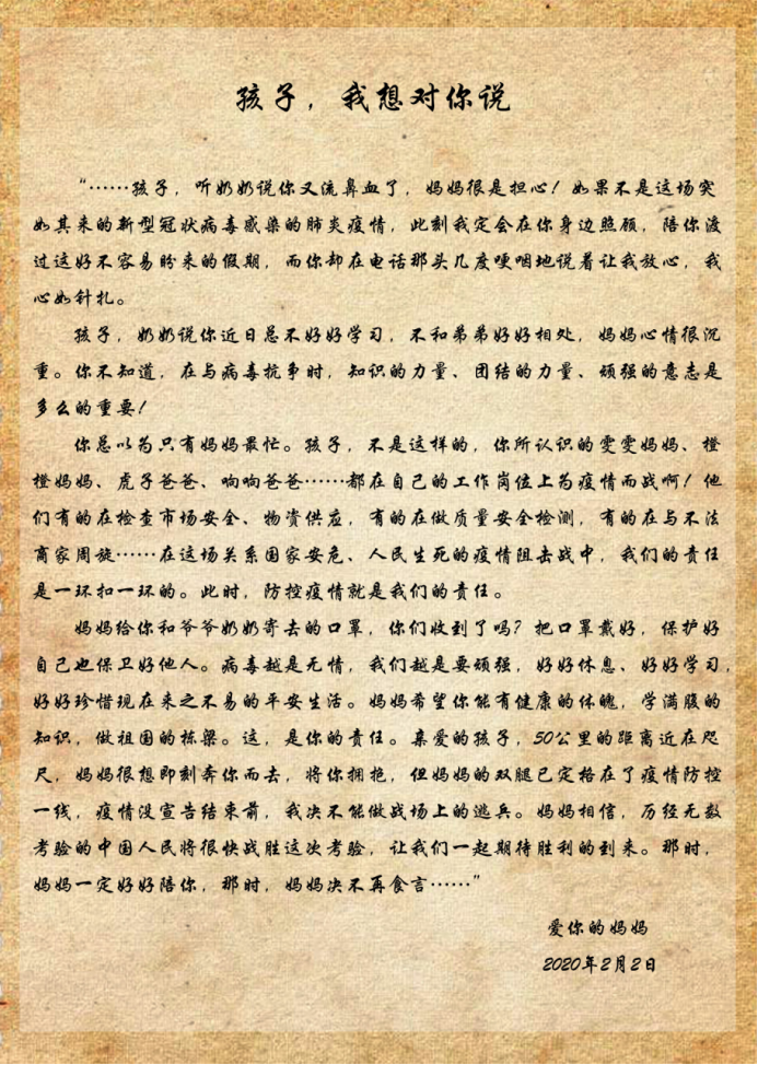 “抗疫妈妈”:家书抵万金 还有位不愿透露姓名的妈妈告诉记者,孩子父亲在外地工作,这位妈妈平日工作忙碌,本打算利用春节假期好好陪伴孩子,但一场突如期来的疫情,让她不得不取消休假,把孩子留在外地爷爷奶奶家,只身赶赴“抗疫”战场,用家书的形式表达对女儿的思念:
