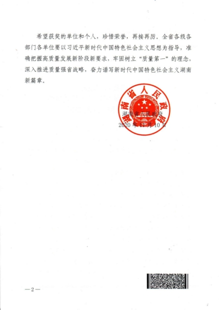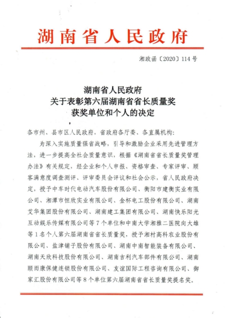 设立于2010年的湖南省省长质量奖,是省政府在质量领域授予各类组织和个人的最高荣誉。该奖主要授予在湖南省登记注册、有广泛的社会知名度和影响力、实施卓越绩效管理模式、质量管理水平和自主创新能力在国内同行业处于领先地位、取得显著经济效益和社会效益的单位,以及为我省质量振兴作出突出贡献的个人。