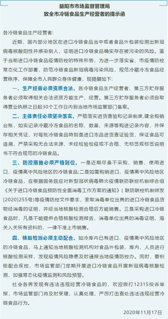 | 益阳市市场监督管理局发布《致全市冷链食品生产经营者的提示函》 |