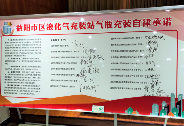 参会益阳市燃气协会和城区16家气瓶充装单位向社会公开作出“严守安全底线”“检瓶不另收费”“鼓励投诉举报”“落实气瓶送检”四项承诺,并欢迎社会各界进行监督。