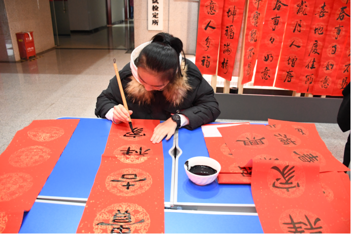 “天增岁月人增寿 春满乾坤福满门”、“一帆风顺年年好 万事如意步步高”……活动现场,墨香飘溢,热闹非凡,大家被一副副吉祥如意的手写春联、一张张饱含真情的福字吸引,几张小小的书桌旁聚满了人,大家一边欣赏一边讨论着每副春联的意蕴,满怀期待地等着成品,争相领取。