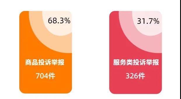 受理投诉举报总数1030件,其中受理商品投诉举报704件,占投诉举报总量的68.3%;服务类投诉举报326件,占投诉举报总量的31.7%。