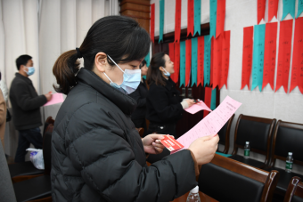 “拜年(打一作家名)”“年终岁尾,不缺鱼米(打一字) ”“你知道谜底是什么吗?”活动现场,机关工会工作人员精心挑选了多条融知识性、趣味性为一体的经典谜语贴在墙上供大家竞猜,让大家乐中有学,共同领略汉语文化的无穷奥妙。大家仔细分析谜面,互相分享自己的想法,有的盯着谜题凝神思考,有的为自己猜中谜底露出喜悦,兴奋地到兑奖处兑换奖品,100多条谜语不久便全部猜完,现场气氛异常热烈。