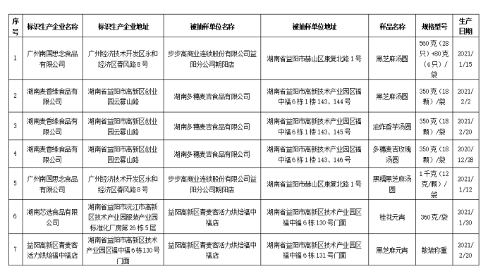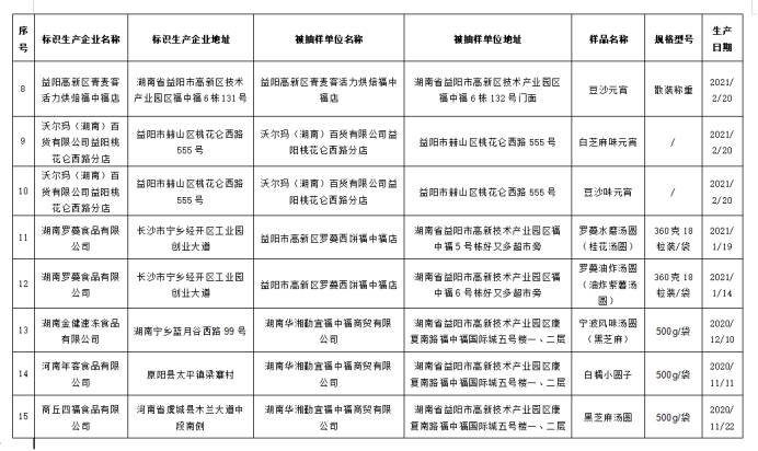 元宵节将至,为了做好元宵节期间节令食品安全监管,益阳市市场监督管理局组织对辖区内步步高、沃尔玛、罗蔓西饼、青麦客等12家超市及糕点连锁店的元宵、汤圆专柜进行食品安全检查,抽检元宵和汤圆15批次,经检验全部合格。 本次食品安全监督抽检样品信息表