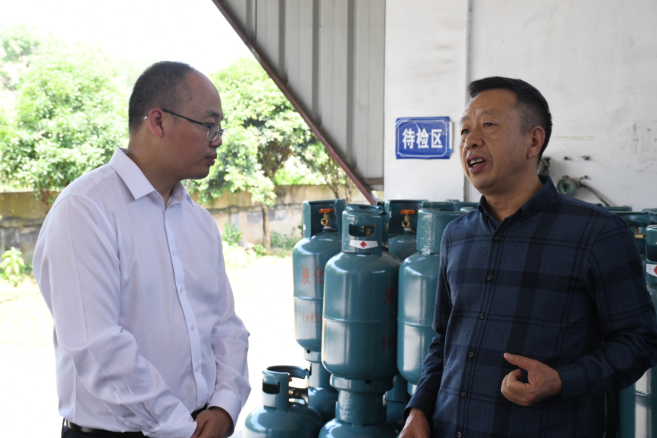 (杨智华(左一)带队在益阳市长坡燃气实业有限公司检查) 杨智华一行先来到益阳市长坡燃气实业有限公司,重点检查企业液化气瓶充装等特种设备管理、特种设备使用管理制度、安全管理员配备等安全生产主体责任落实情况,对检查中发现的问题,要求企业限期整改。