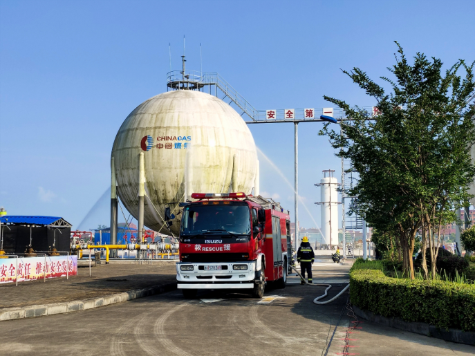 演练现场,益阳中燃城市燃气发展有限公司气化站输配员在正常巡检过程中,发现液化天然气储罐下进液根部阀储罐侧泄漏直冒白烟。气化站输配员发现险情后,立即报告调度中心,启动公司应急预案,展开联合特种设备维修抢险救援工作。应急抢险组、环境监测组、现场警戒组、工程技术组等应急抢险小组迅速行动,配合有序。在总指挥的现场指挥下,报警、灭火、现场处置稳步有序,模拟突发灾情得到了较好的控制,不到半个小时,泄漏点成功堵漏,险情被有效控制。
