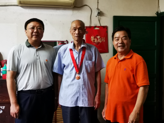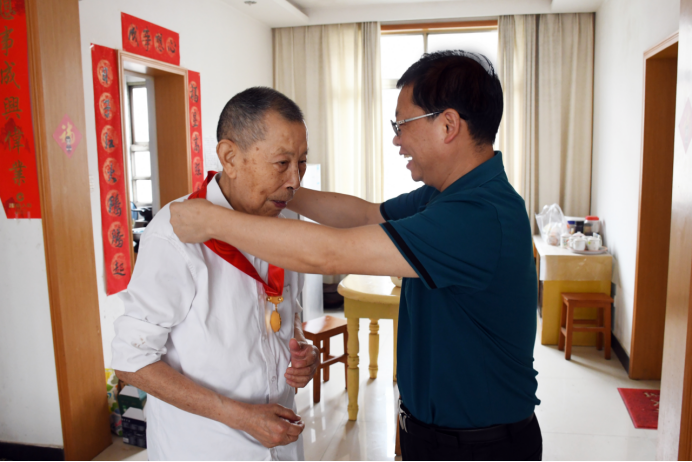 (朱崇文(左一)为老党员易秋龙佩戴纪念章) “感谢党组织的照顾和关怀,在新时代给予我们新的荣誉。”在老党员何荣家中,当龚悟云为他佩戴“光荣在党50年”纪念章时,他连声道谢,激动之情溢于言表。今年91岁的他,已有70年党龄,他说,这枚纪念章是他曾经艰苦奋斗的见证,象征着光荣与荣耀。