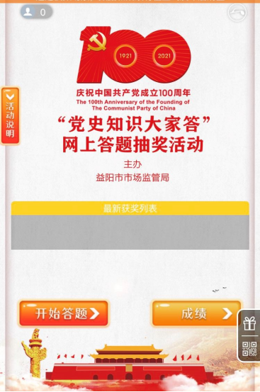 据了解,为深入开展党史学习教育,庆祝中国共产党百年华诞,益阳市市场监管局通过官方微信公众号举办了此次答题活动。活动采取“随机抽题、限时作答”的方式进行,内容包党史、新中国史、改革开放史、社会主义发展史等。凡“益阳市场监管”微信公众号用户,每天可获得两次答题机会,每次全部答对者可以参与抽奖,转发再送一次机会。
