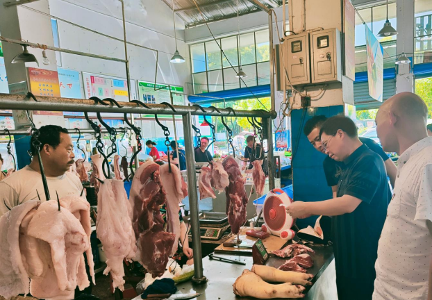 (龚悟云和执法人员检查农贸市场猪肉摊点检验检疫情况)