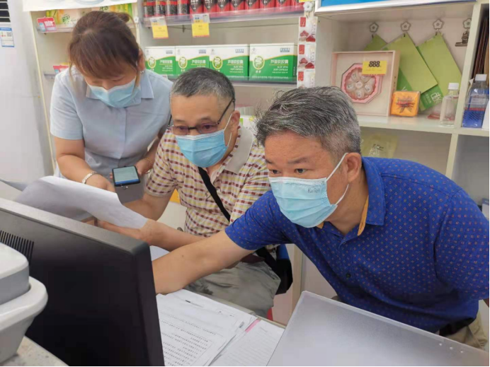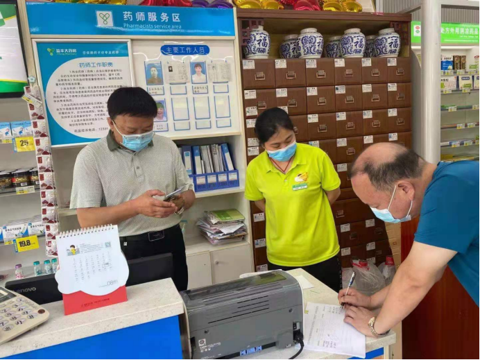(督查组在进口冷链食品经营企业开展督查) 强化“四类药品”销售监测,充分发挥药品零售企业“哨点作用” “疫情防控人人有责,我们对顾客严格实行扫码准入和实名登记制度。”在老百姓大药房连锁股份有限公司益阳五一西路店,店堂醒目位置处已张贴好了注册申领二维码、验码通行二维码、个人轨迹查询码,药店工作人员正在对入店购药人员实行三码联查操作。紧靠旁边的工作台上摆放有“购买四类药品人员实名登记台账”、消毒液和手持测温枪。带队领导鲁志强一边翻阅工作台账,一边抽查药店计算机工作系统,仔细核对退烧、止咳、抗病毒、抗生素四类药品零售销售情况及购买人员信息数据,全面排查风险隐患。要求药品零售企业切实履行企业主体责任,充分发挥疫情防控“哨点作用”,不打折扣、不留死角,把各项防疫措施抓紧抓实抓细,切实保障好辖区群众用药和生命安全。
