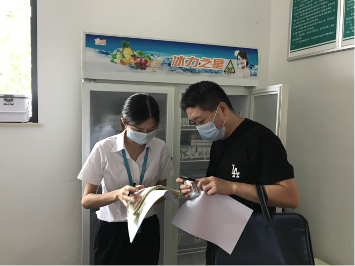 (督查组在药店开展防疫措施落实情况督查) 据了解,自7月29日全市疫情防控工作紧急调度会召开以来,益阳市市场监管局快速响应,主要领导连续召开三次重要会议,专题研究部署市场监管重点领域疫情防控工作,广泛宣传发动,快速推进药店扫码准入、“四类药品”销售监测等各项防疫举措,全力抗击疫情。目前,全市系统共督查药店760家,现场下达责令改正通知书36份,对检查中发现的部分药店台账不全、消杀记录不完整、工作人员未佩戴口罩等问题提出整改要求,并交由所在地市场监管部门核查,形成检查闭环。 加强新冠病毒疫苗监管,全力构建安全有效的免疫屏障 下午3点30分,督查四组在完成一家药店的检查后,紧急赶赴南县人民医院新冠疫苗接种点,开展疫苗质量管控监督检查。督查组针对新冠疫苗的购进渠道、分发流向、冷链管理、信息追溯等环节逐项核查,重点检查了收货验收资料是否齐全且按规定记录,仓储运输设施设备是否符合规定,仓储运输过程是否符合疫苗冷链保存要求且按规定记录温度情况,运输交接记录是否完整等。检查中未发现有非法渠道购进和失效期疫苗,该接种点严格遵守全程冷链要求,较好保证疫苗安全有效。