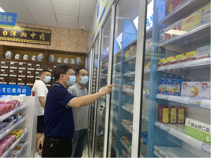 “请出示您的健康码、行程码和新冠病毒疫苗接种金边二维码!”每到一家药店,营业员严格对入店人员进行“三码”查验、测温记录等防疫工作。龚悟云主动配合查验,并重点查看了药店“四类药品”暂停销售落实情况。从现场来看,药店都已下架退热、止咳、抗病毒、抗生素等相关药品。龚悟云对药店克服困难,积极主动落实各项防疫措施表示肯定,要求严格做好下架药品的储存保管,继续落实好“戴口罩、量体温、查三码”等疫情防控措施;基层市场监管人员要切实履职尽责,扎实开展药店疫情防控工作督查,不留盲区,不留死角。