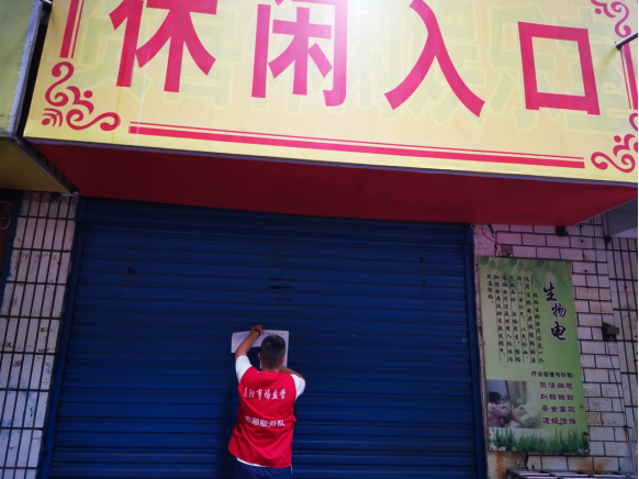 为继续从严管控中心城区聚集性场所,提高辖区居民对疫情防控的责任意识,连日来,市市场监管局派驻志愿者会同资阳区建设街社区的工作人员, 按照网格化的模式对辖区内所有聚集性场所进行了摸排管控,并张贴了《中共益阳市新冠肺炎疫情防控工作领导小组关于继续从严管控中心城区聚集性场所的通告》。