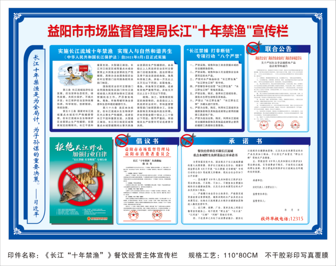 “长江十年禁渔是为全局者计,为子孙谋的重要决策。”近日,益阳市市场监管局为餐饮服务单位、商场超市等重点涉“渔”场所统一安装起长江“十年禁渔”宣传栏,宣传内容丰富、画面美观,宣传标语、法律法规等工作要点一看便知。截至目前,3000份宣传栏已全部安装到位。