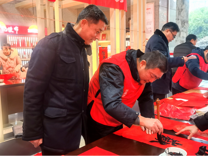 天冷寒气逼人,活动现场却墨香四溢、暖意融融。只见桌子依次排开,红纸、笔墨一应俱全,来自局机关的书法爱好者们现场挥毫泼墨,凝神运笔,将心底的美好祝愿化作一张张寓意吉祥的书法作品。前来围观、领取春联和福字的干部职工络绎不绝,大家有的帮忙挑选对联内容,有的帮忙传递纸墨,有的帮忙裁纸,现场处处洋溢着春的温暖、年的祥和。