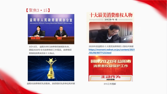 加强与上级部门的请示汇报,与媒体单位的工作联动,争取工作支持与指导,解决人才、技术和平台等宣传瓶颈,拓展传播阵地。通过策划一批重大活动,推出一批热度作品,开辟一批特色栏目,力求市场监管宣传效果最大化。 期间,组织的315国际消费者权益日、知识产权宣传周、食品安全宣传周、质量宣传月等系列宣传活动,社会反响强烈。人民日报客户端、国家市场监管总局网、中国市场监管报、湖南日报、湖南卫视新闻联播等多次报道了疫情防控、优化营商环境、放心消费创建等工作举措。此外,还联合市委宣传部在市直媒体平台开辟“食安益阳”“诚信益阳”“益阳质量”“女侠五人组”等特色专栏,讲述食品安全监管、诚信经营、质量标杆企业、消费者维权的故事,深受群众好评。2021年,益阳市市场监管局在国家级、省级和市级主流媒体平台发稿2252篇次,在国家级、省级主流媒体的发稿数量实现新突破。 |