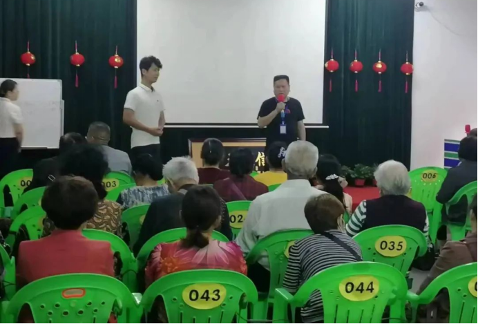 赫山区局执法人员在会议营销场所向参会老年人讲解会议营销的欺骗性、危害性