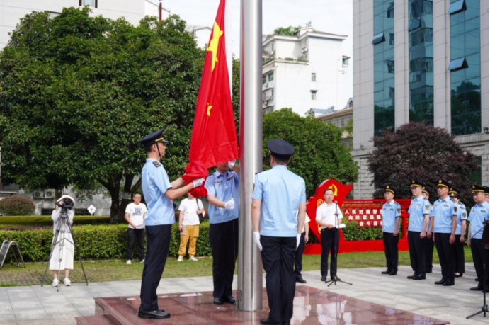 上午8点30分,参加仪式的执法干部身着统一新式制服整齐列队,身姿挺拔、精神抖擞,国旗护卫队迈着整齐的步伐走向升旗台,目光坚毅、英姿飒爽。大家高唱中华人民共和国国歌,目送着鲜艳的五星红旗冉冉升起。随后在市市场监管局党组书记、局长朱崇文的带领下,全体同志高举右手,面向国旗,庄严宣誓。誓言铿锵有力,表达了坚定不移投身新时代市场监管事业的赤诚忠心,展现了维护市场秩序,守护人民群众生命健康安全的坚定决心。