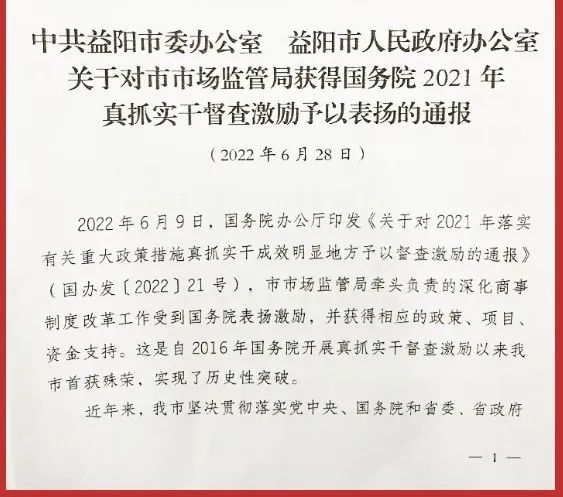 近日,益阳市委、市政府以益办[2022]19号文件下发通报,对市市场监管局获得国务院2021年真抓实干督查激励予以通报表扬,号召全市各级各部门学习借鉴市市场监管局经验做法,奋力创先争优,不断开创各项工作新局面。