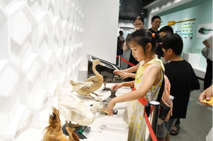随后,大家来到来仪湖国家湿地公园展示馆,体验了我市南洞庭湿地的生物多样性和文化多样性,了解了湿地保护的重要性。孩子们兴致勃勃地边看边记录,了解了来仪湖湿地公园的基本情况,熟悉了湿地里鸟类、鱼类、两栖类、爬行类、植物类等生物的形态和数量,并通过图片,影像资料深切地感受到湿地的美丽,其中,标本展示区活灵活现的动植物标本牢牢吸引着大家的眼球,令他们久久不愿离去。大家还参观了历史名人馆和民俗文化馆等展厅,对家乡的历史和风俗有了更深的了解。