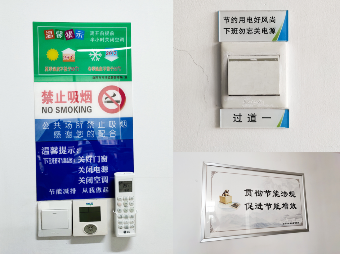 在市市场监管局大楼,在自然光照充足的区域和时段,室内电灯关闭,室内空调面板显示的温度均在27℃、28℃左右,大厅、走廊随处可见“节约用电、节能减排、随手关灯”等标识标语。 为做好节约用电工作,市市场监管局要求,局内各办公场所严格执行夏季室内空调温度不低于26℃的标准,开空调时不开窗,无人时随手关闭,下班前提前半小时关停。落实照明管控,充分利用自然光采光,节约照明用电,杜绝“白昼灯”“长明灯”“无人灯”。办公区域建筑外立面的灯光照明、亮化工程、景观灯无特殊情况一律关闭,电子屏非必要一律关闭。提倡低楼层步行,尽量减少电梯运行。下班后自觉关闭电脑、路由器、打印机等办公设备,做到随用随开、不用不开。