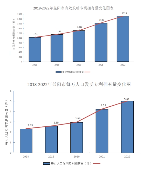 落实“三高四新”战略定位 推进知识产权强市建设 近年来,益阳市紧抓我国从知识产权引进大国向知识产权创造大国转变的契机,以建设国家知识产权强市试点城市为抓手,深入贯彻实施知识产权战略;积极配合我省“三高四新”战略实施,加快建设知识产权体系,优化营商环境,打造先进制造业高地; 益阳市委市政府高度重视知识产权发展战略,将知识产权工作写入《政府工作报告》,将知识产权工作纳入政府工作人员考核体系;并成立由分管副市长邓曙光任组长的市知识产权协调领导小组,统筹协调全市知识产权工作;益阳市市场监督管理局还与益阳市发改委联合发布《益阳市“十四五”知识产权发展规划》,与益阳市财政局联合发布《益阳市知识产权高质量推进专项资金管理办法》,合力解决知识产权工作中的难点,打造“活力无限 创新益阳”。 益阳市科技事业蓬勃发展,知识产权工作取得较大成效。2018年,益阳市每万人口发明专利拥有量仅2.33件,2022年增加到5.01件,增幅215%,稳居湖南省第5位;2018年益阳市有效发明专利拥有量1027件,2022年为1916件,增幅187%,位居全省第7位;机关团体贡献有效发明专利量140件;益阳市国家知识产权优势示范企业34家,居全省第二名;拥有5件以上有效发明专利单位72家,中国专利优秀奖3个;省专利二等奖1个,三等奖4个。
