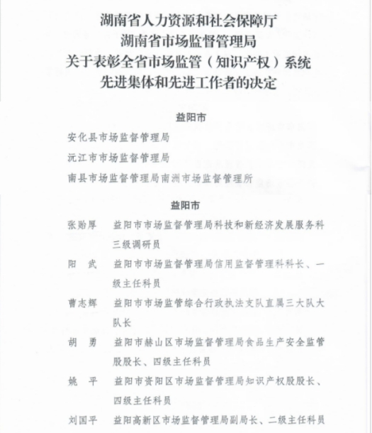 安化县市场监管局、沅江市市场监管局和南县市场监管局南洲市场监管所等3个单位获全省市场监管(知识产权)系统先进集体;张贻厚、阳武、曹志辉、胡勇、姚平、刘国平等6名同志获全省市场监管(知识产权)系统先进个人。