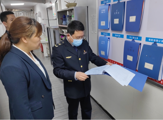 朱崇文实地检查了原材料仓库、生产制作间、就餐场所和清洁消毒等设备设施,查看了原料采购验证、留样管理等食品安全溯源记录,了解了企业开展“日排查、周管控、月调度”管控情况和问题整改落实情况。
