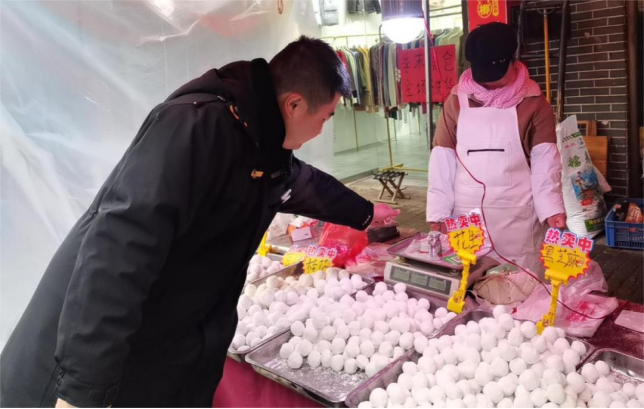 检查人员以农贸市场、超市、个体摊贩、各经营门店为重点检查对象,重点检查元宵、汤圆、饺子等节令食品,仔细查看经营户证照是否齐全、计量器具是否存在违规情况、元宵制作环节、环境卫生情况、销售贮存环境温度是否达标等,确保检查全覆盖、无死角。现场发现散装汤圆制售区域未加防尘盖、散装食品标签填写不规范问题,及时给予指导规范。同时随机抽检个体摊贩、经营门店制作销售的汤圆、元宵64批次。