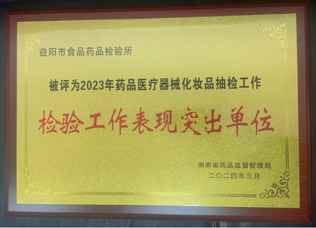 在2024年3月20日召开的省药品稽查执法与监督抽检暨药品安全巩固提升行动会议上,益阳市食品药品检验所获评2023年药品医疗器械化妆品检验工作表现突出单位。
