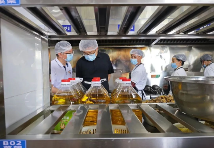 督导组一行详细了解了学校就餐人数、供餐模式及食品安全管理制度落实情况。朱春光同志实地检查了食堂操作间、原料仓库、备餐间等重点区域,对食材采购溯源、餐具消毒保洁、从业人员健康管理、食品留样、家长陪餐等工作进行了细致查验。朱春光同志指出:“校园食品安全关系千家万户,必须坚决落实‘四个最严’要求,确保每个环节都经得起检验。”