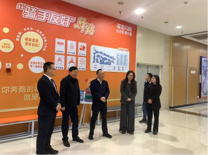 在万达广场“友好商圈”,曹佰龙重点考察了党组织在商圈服务提升中的引领作用。他指出,商圈党支部作为功能型党支部,要积极推动党的元素融入服务场景,并逐步向实体性党支部转化,切实发挥战斗堡垒作用,将服务阵地同步打造为党建宣传阵地。在察看骑手专用电梯、外卖车辆临时停放区及便捷引导系统后,他对现有设施提升配送效率的成效给予肯定,并要求进一步发挥商圈党支部桥梁纽带作用,推动组建商家志愿服务队,探索设立“滴滴候车区”与线上线下意见征集栏,鼓励骑手通过多种渠道反映诉求、参与治理,实现党建与服务深度融合、双向促进。
