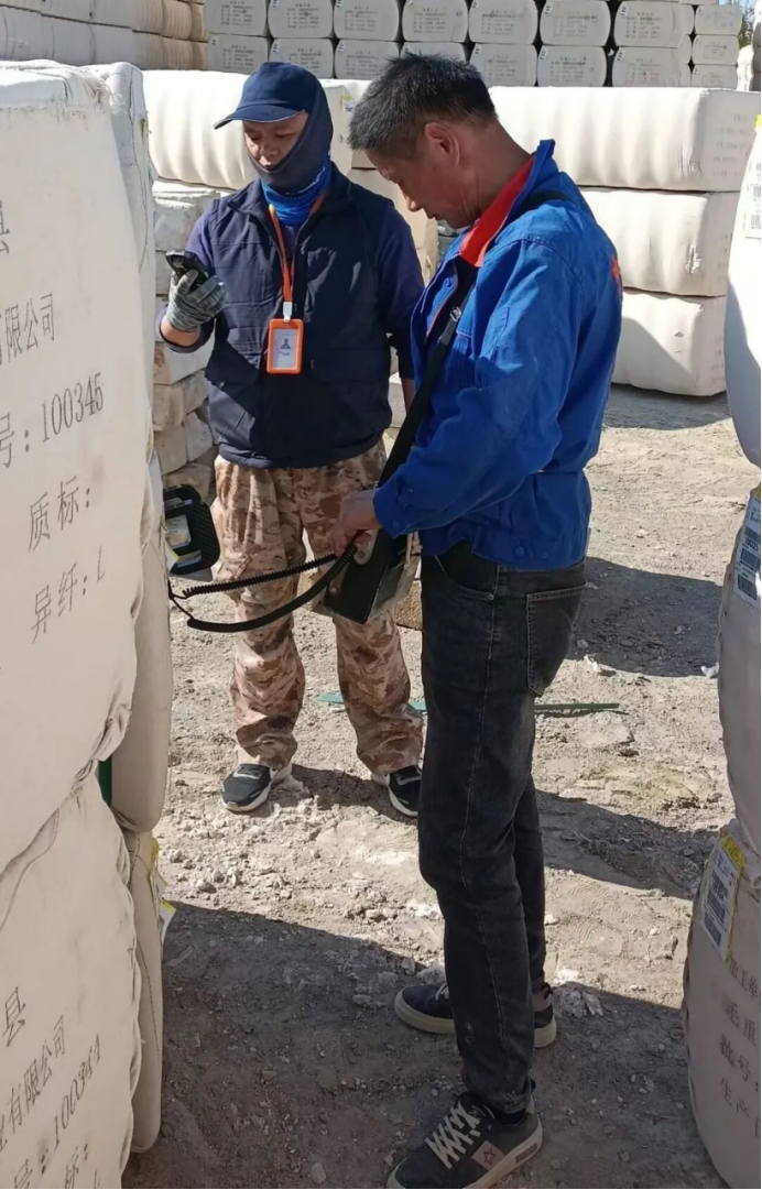 在棉垛前,检验员小吴的操作行云流水。他首先将温度补偿器的探针稳定地插入棉包,如同布下一枚精准的“温度哨兵”。随后,他举起蓝牙扫描枪,对准棉包上清晰的条形码。“滴”的一声脆响,这并非一次简单的信息录入,而是向整个协同网络下达了启动测量的核心指令。