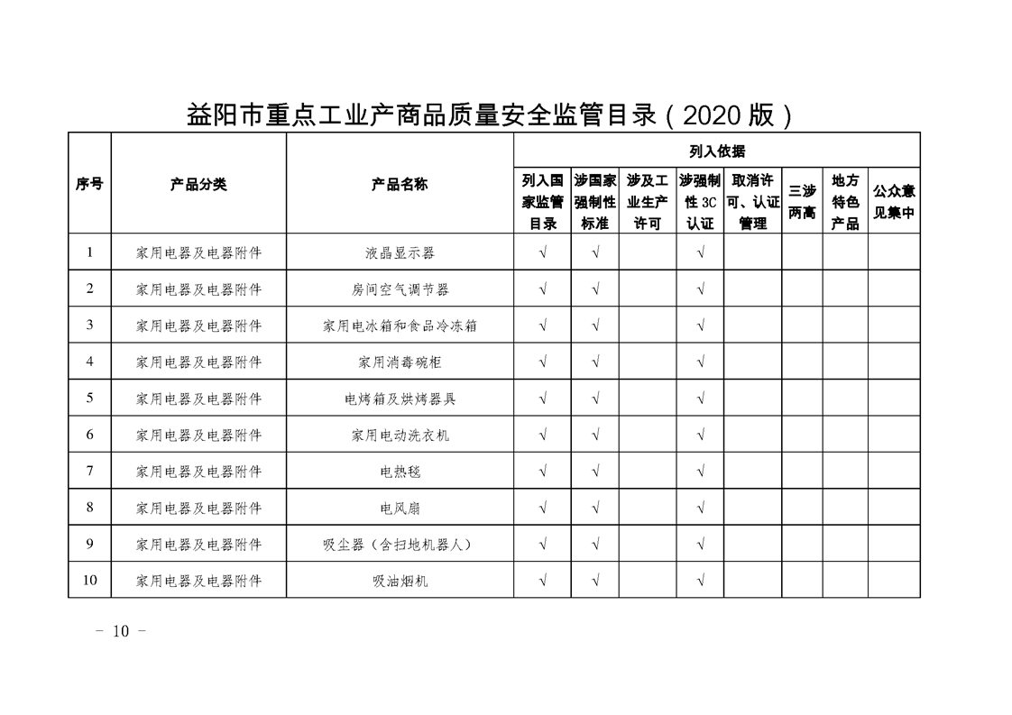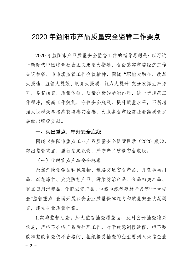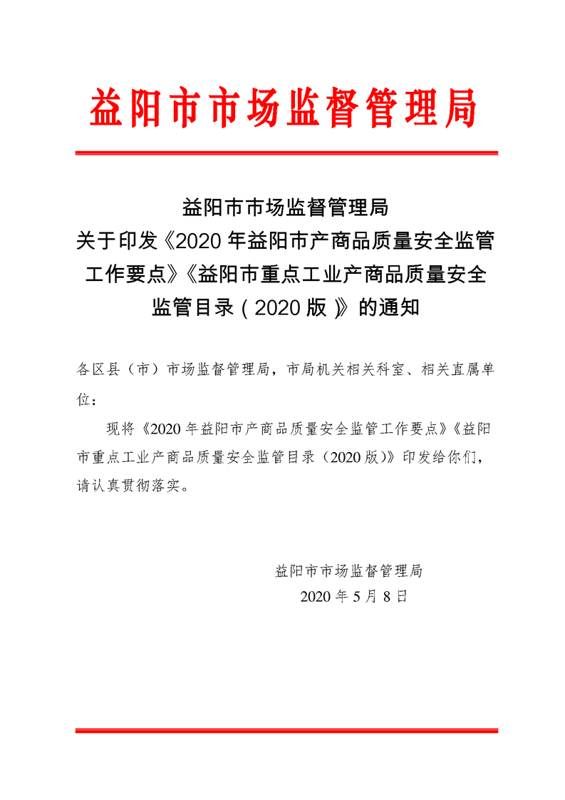 | 关于印发《2020年益阳市产商品质量安全监管工作要点》《益阳市重点工业产商品质量安全 监管目录(2020版)》的通知 |