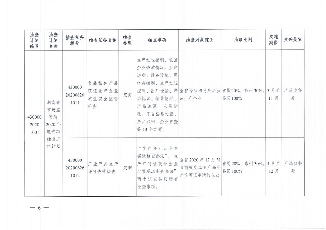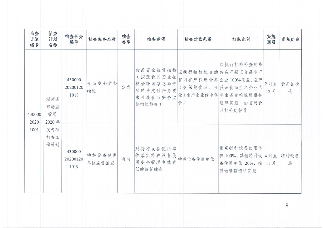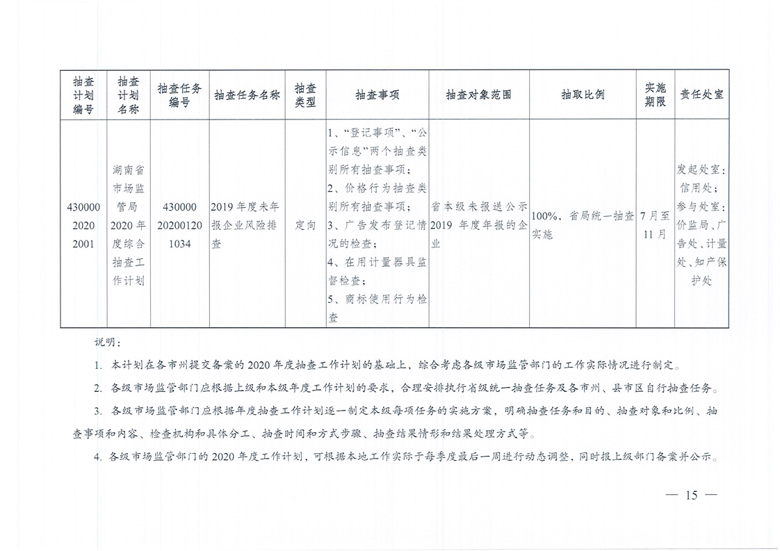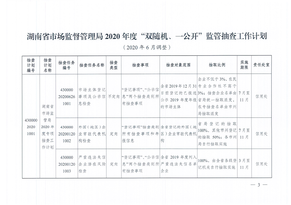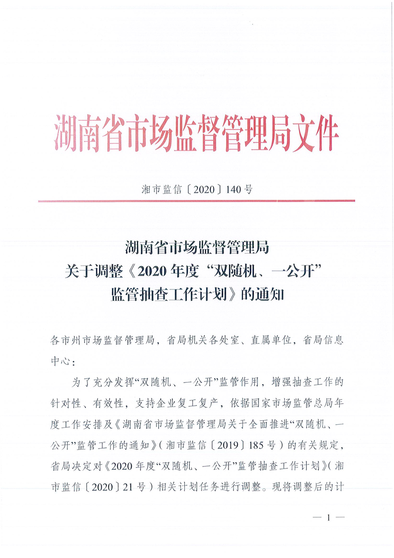 | 湖南省市场监督管理局关于调整《2020 年度"双随机、一公开"监管抽查工作计划》的通知 |