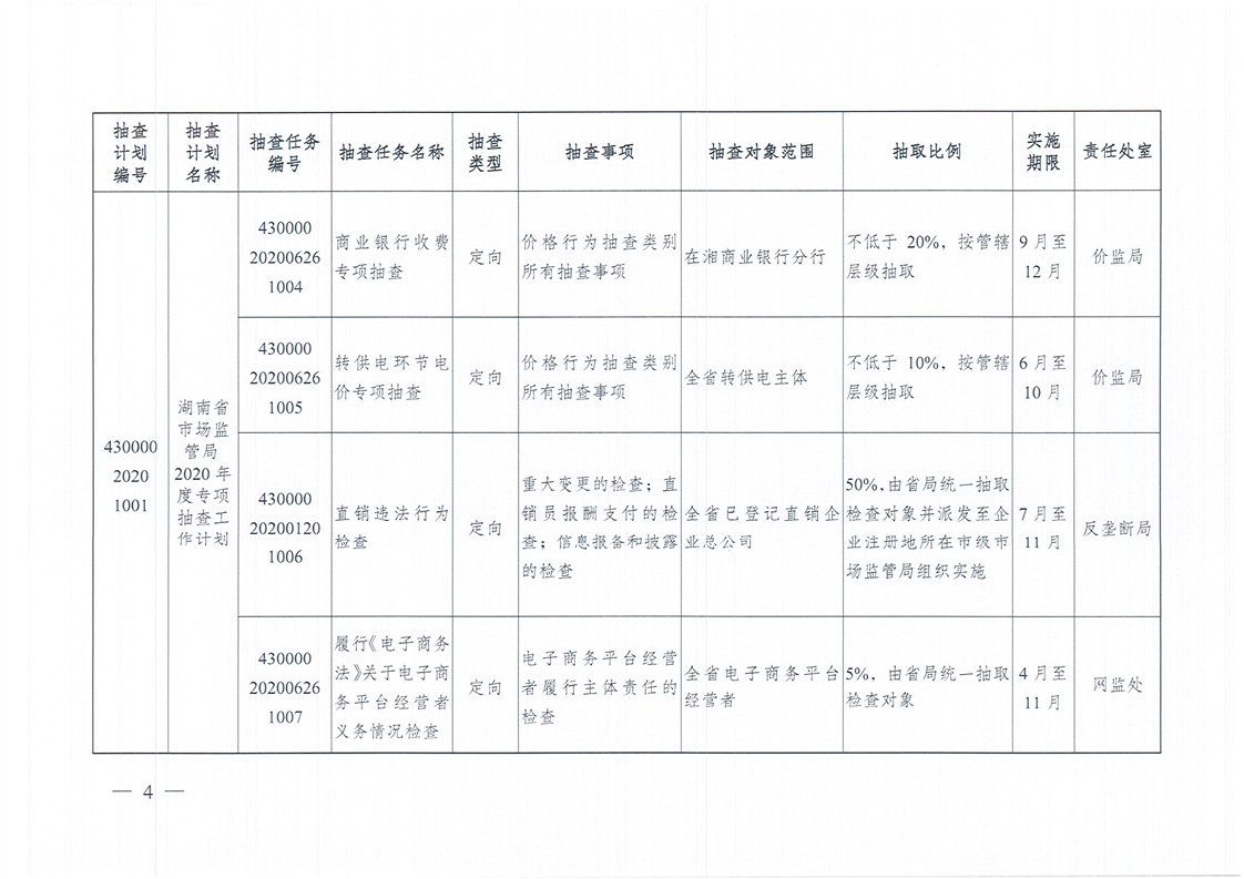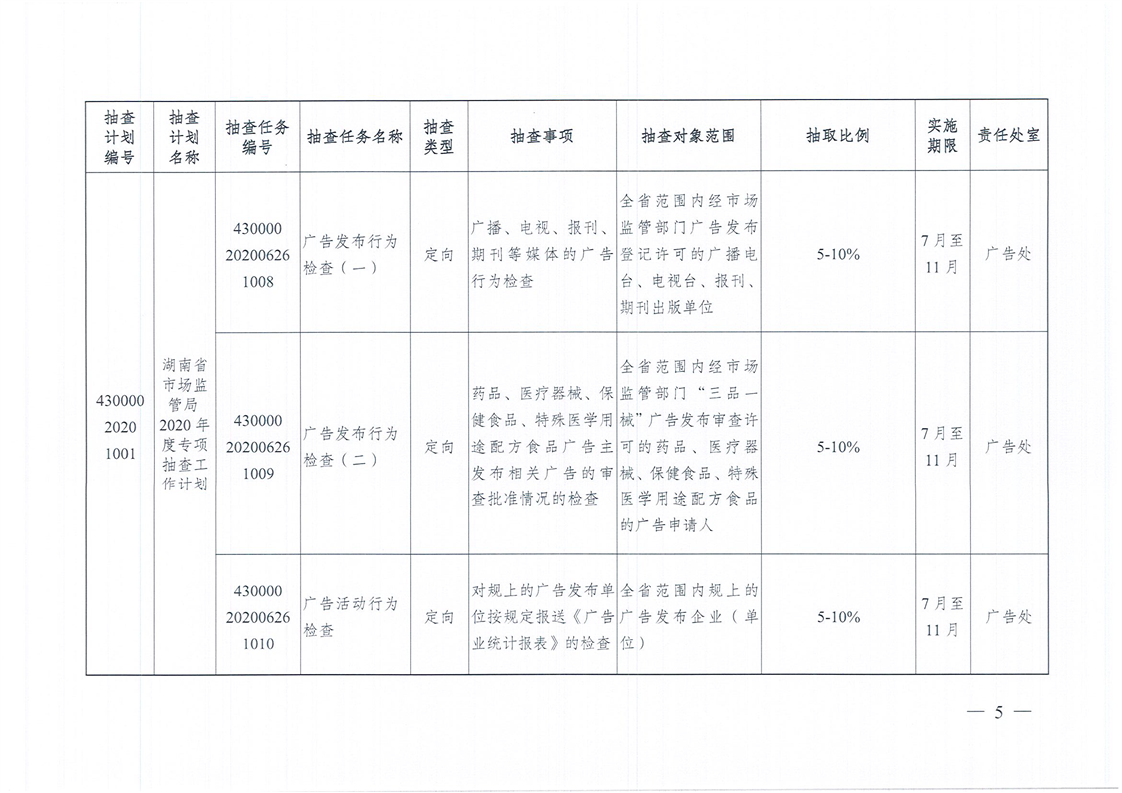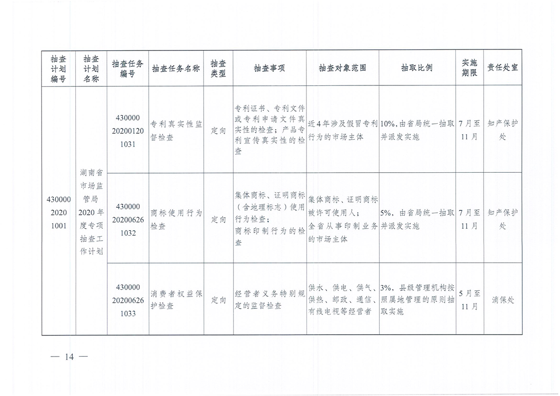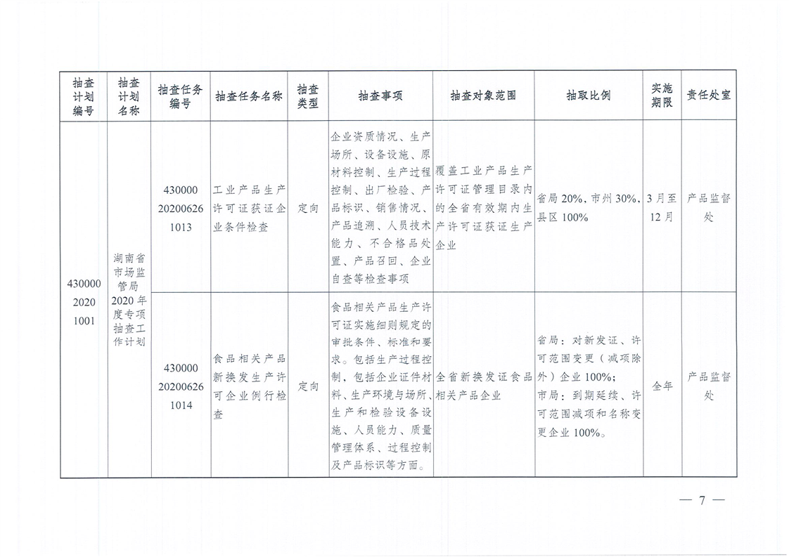 | 湖南省市场监督管理局关于调整《2020 年度"双随机、一公开"监管抽查工作计划》的通知 |