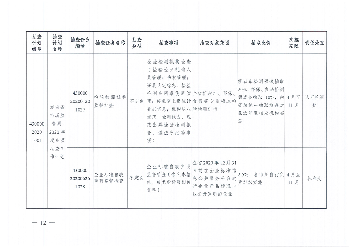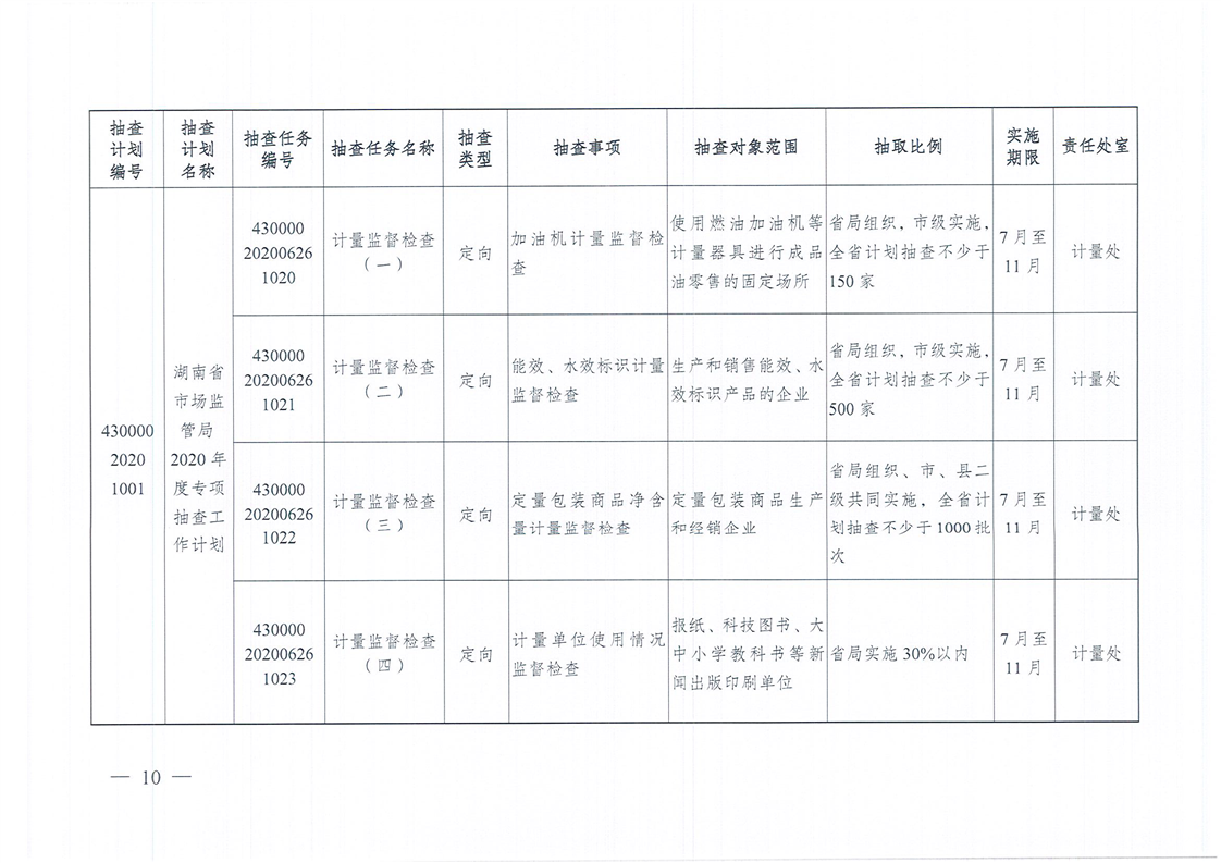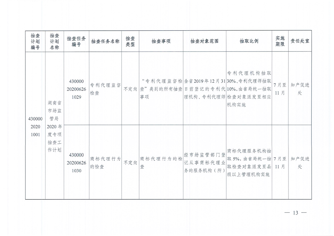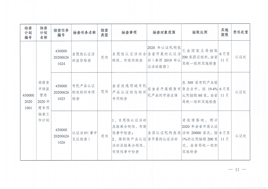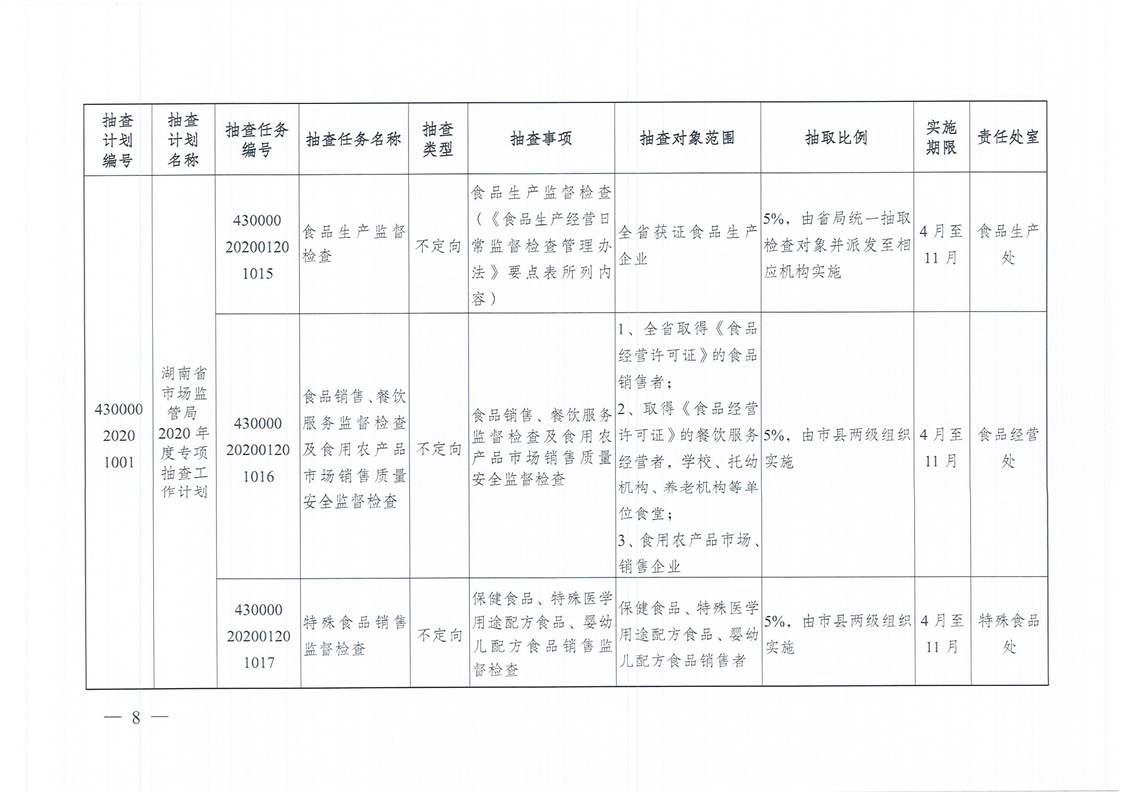 | 湖南省市场监督管理局关于调整《2020 年度"双随机、一公开"监管抽查工作计划》的通知 |