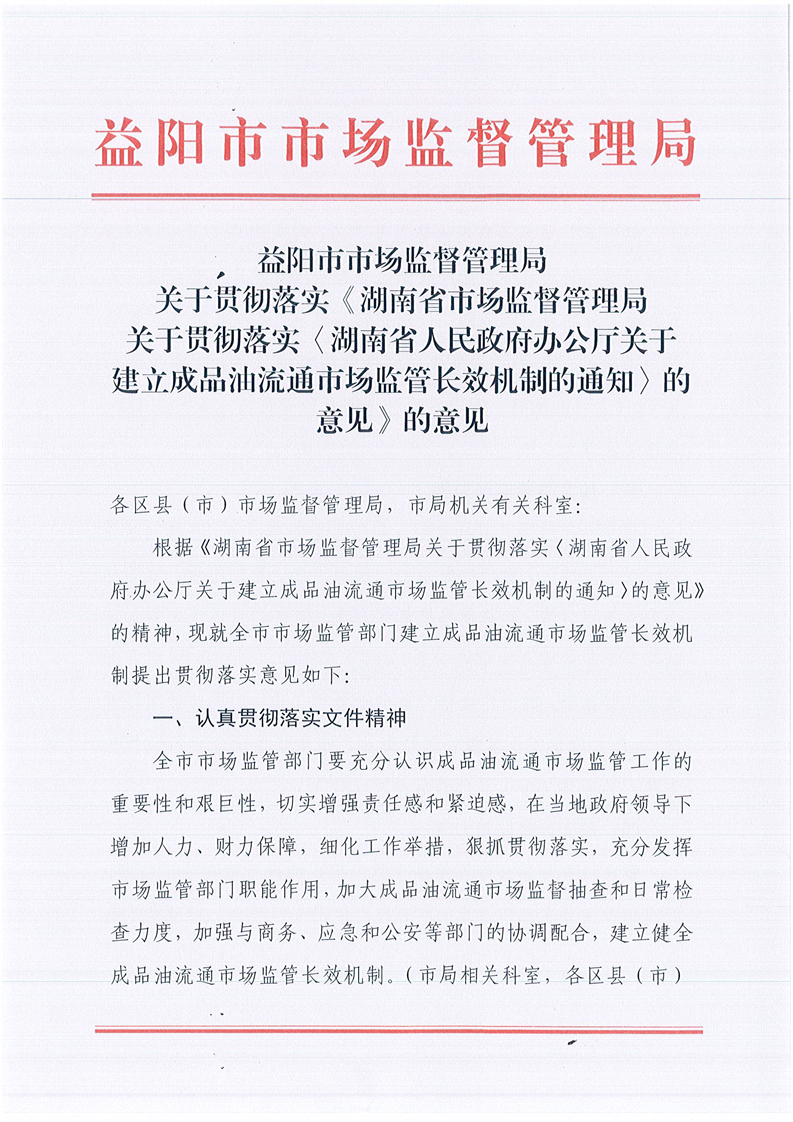 | 关于贯彻落实《湖南省市场监督管理局关于贯彻落实〈湖南省人民政府办公厅关于建立成品油流通市场监管长效机制的通知〉的意见》的意见 |