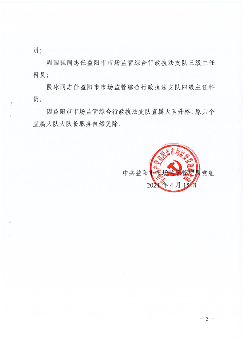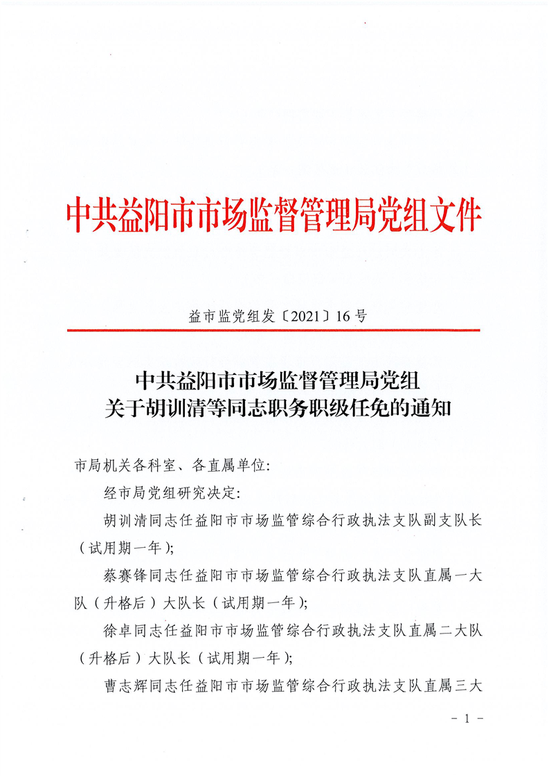 | 益市监党组发〔2021〕16号:关于胡训清等同志职务职级任职的通知 |