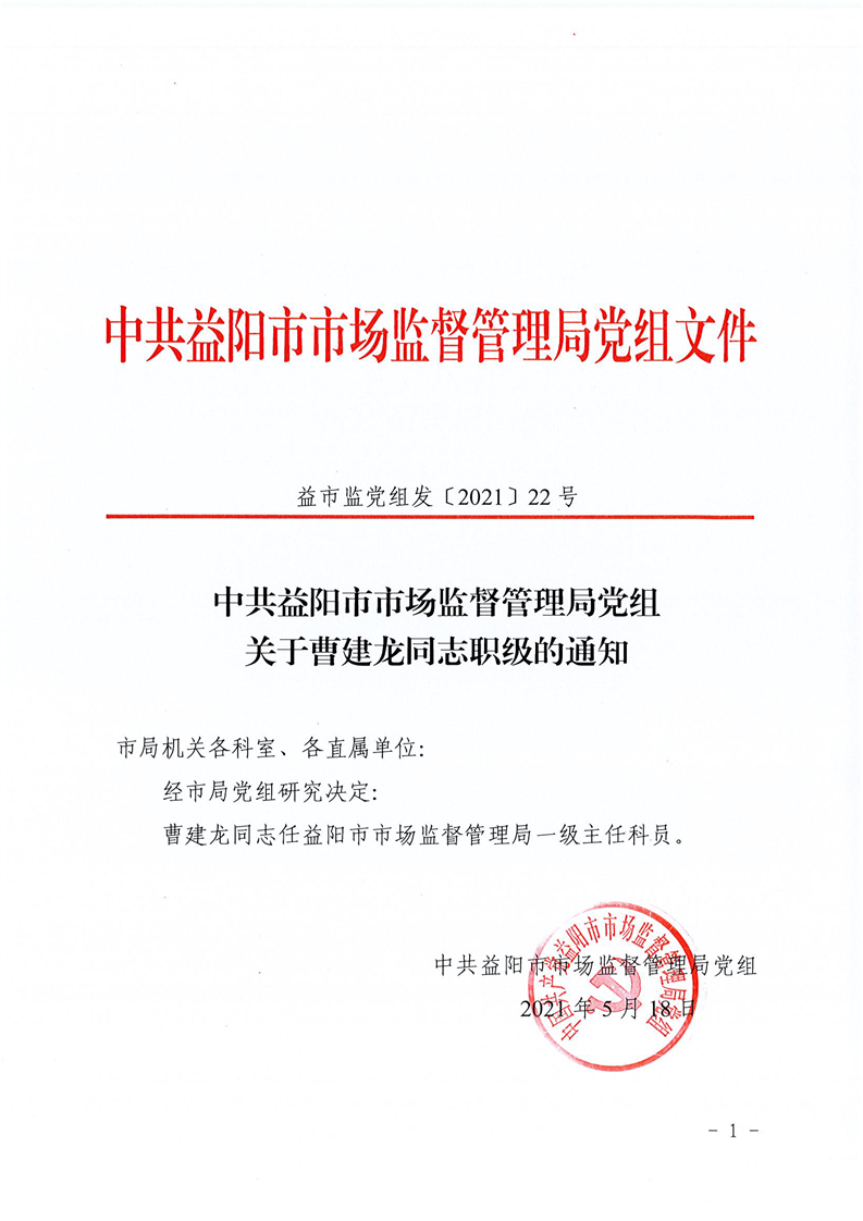 | 益市监党组发〔2021〕22号:关于曹建龙同志职级的通知 |