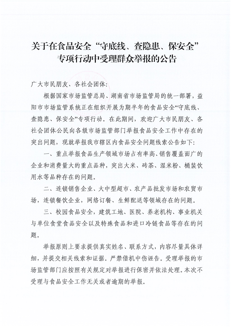| 关于在食品安全“守底线、查隐患、保安全”专项行动中受理群众举报的公告 |