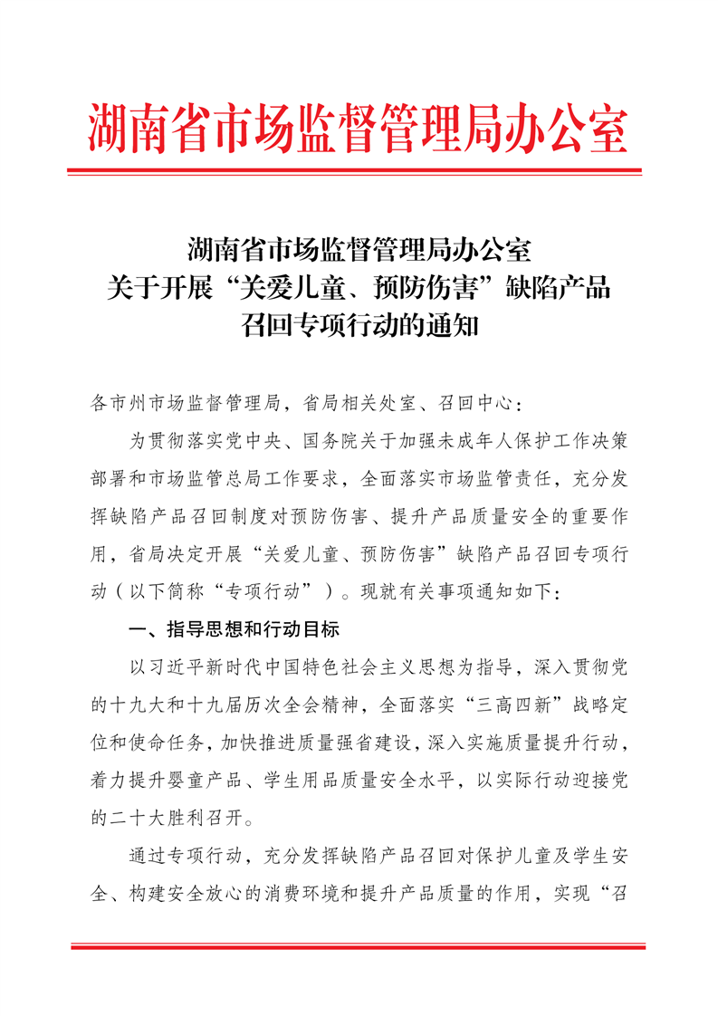| 关于开展“关爱儿童、预防伤害”缺陷产品召回专项行动的通知 |