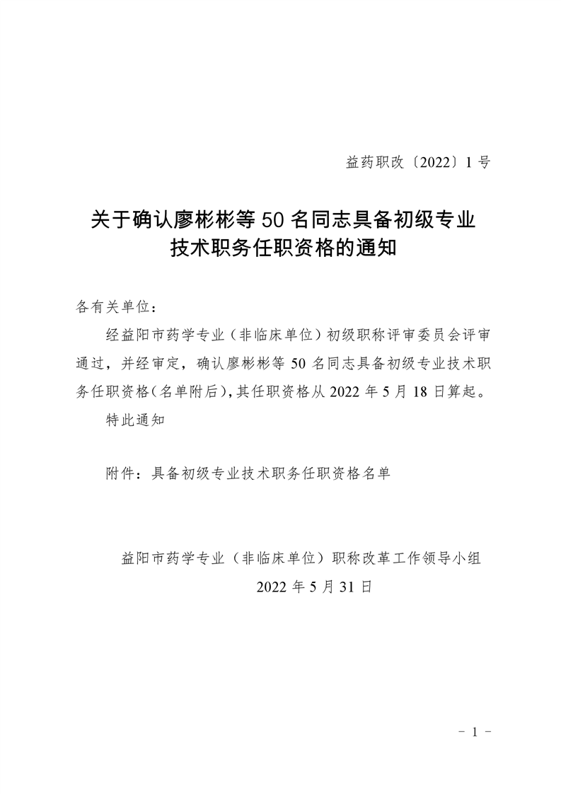 | 关于确认廖彬彬等50名同志具备初级专业技术职务任职资格的通知 |